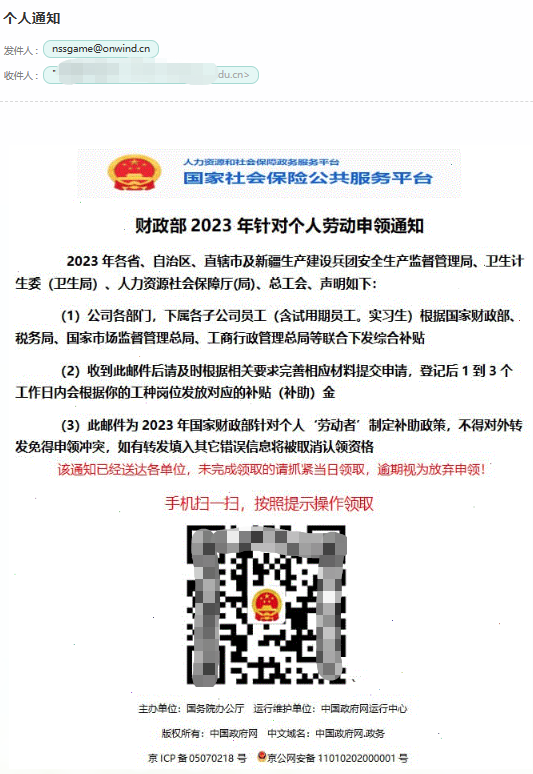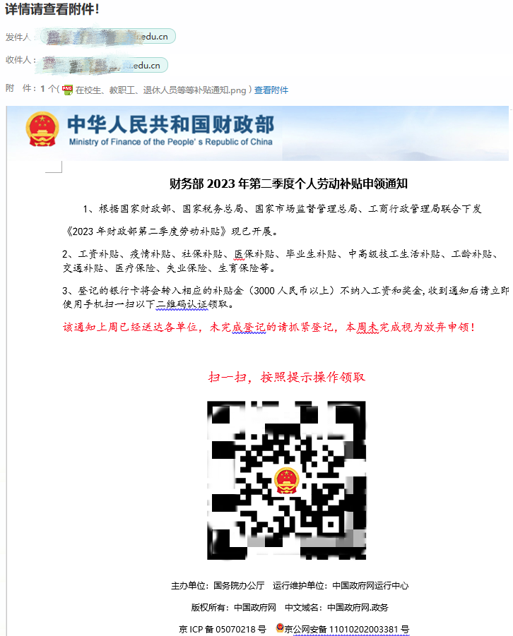 再次提醒,不存在扫二维码、领补贴!以下是补贴类钓鱼邮件截图,请对比识别;这类邮件一般打着国家XX部的旗号,在邮件正文 或 附件中有个醒目的二维码,扫码就落入扣款陷阱。