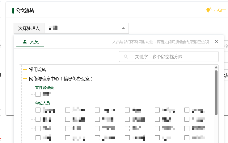 在任意一份公文中点击“选择处理人”下拉框,在人员标签页下展开单位即可查看对应的文件管理员。