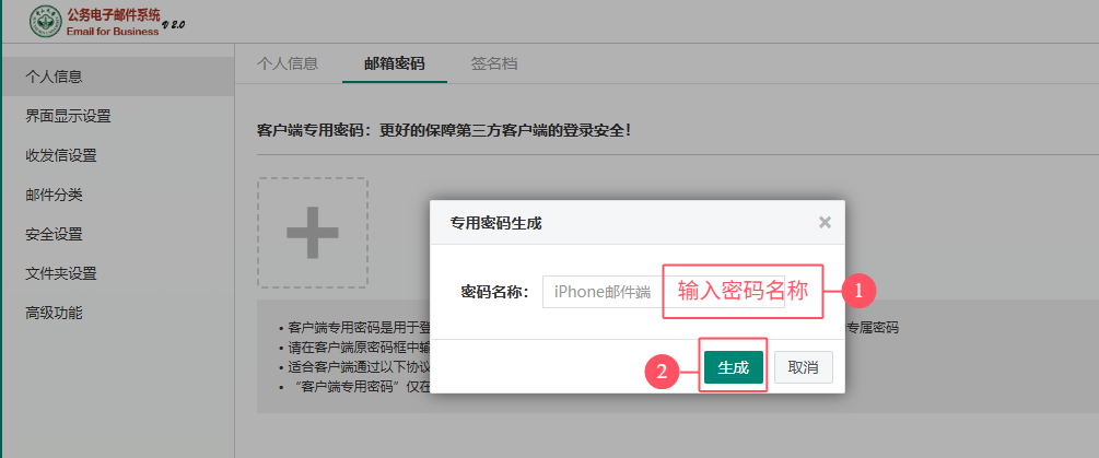2. 生成客户端专用密码,输入密码名称(命名随意,便于区分即可,例如用于iPhone邮件客户端的可输入:iPhone),点击【生成】,即可生成一个专用密码;