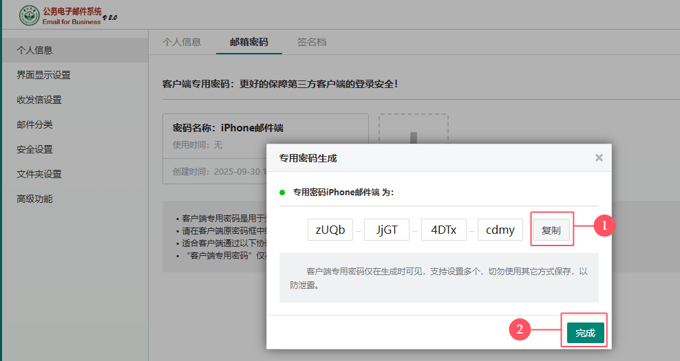 3. 客户端专用密码是一串16位随机密码(不含空格及其他特殊字符),点击【复制】即可复制专用密码,可将密码粘贴到邮件客户端的“密码”设置处。对于手机邮件客户端,可使用微信等临时发送密码到手机端,设置完成后,务必删除密码发送记录。