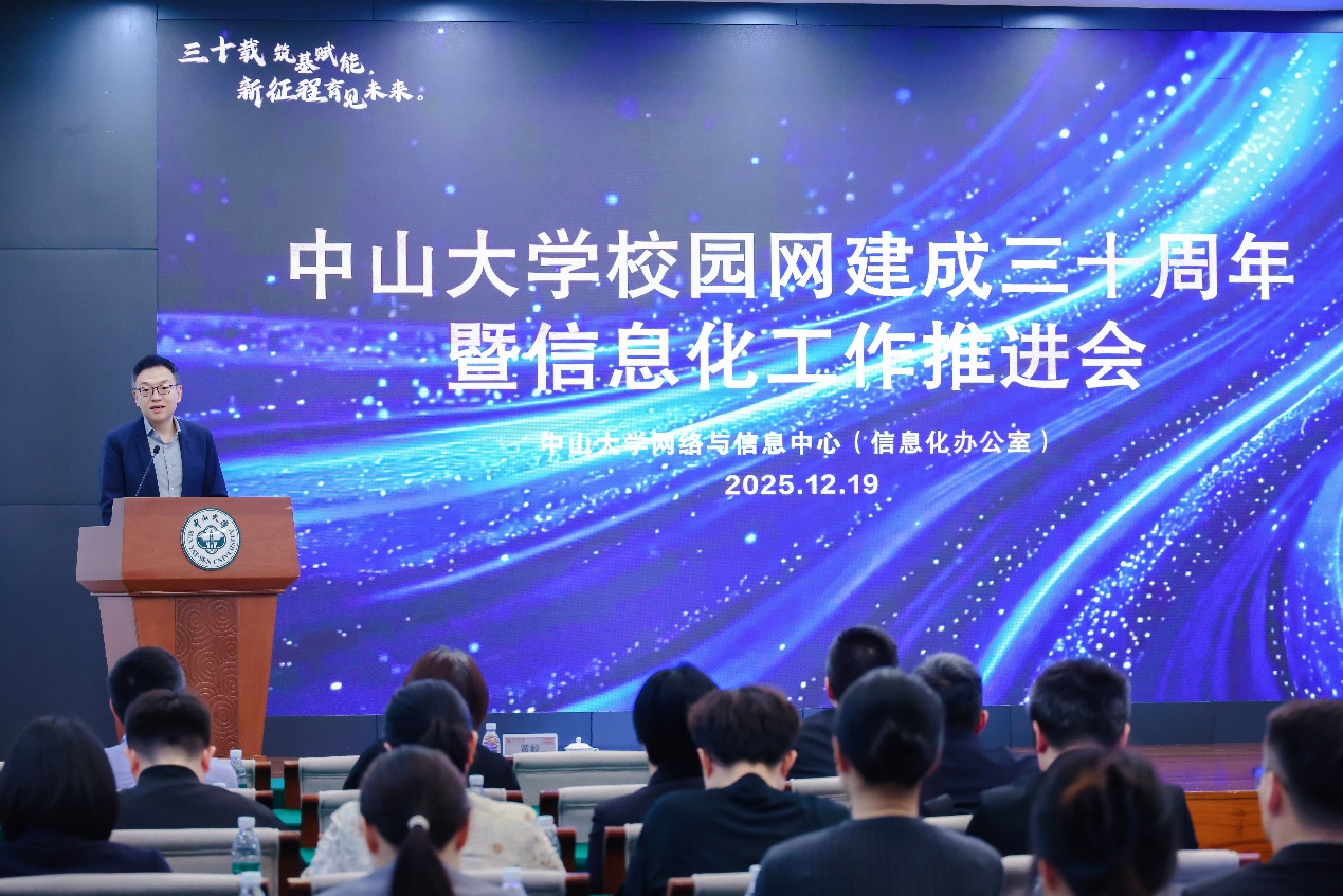 学校党委副书记王帆代表学校党委,对为我校网络信息化过去三十年发展的所有贡献者表示衷心的感谢,也指明了未来信息化工作的方向。他指出,30年前,中山大学以拓荒者勇气点亮信息化星火;今天,我们迎来人工智能时代的教育变革。未来五年,学校将拥抱AI+行动,推动信息技术与高等教育深度融合,打造高质量发展新引擎。