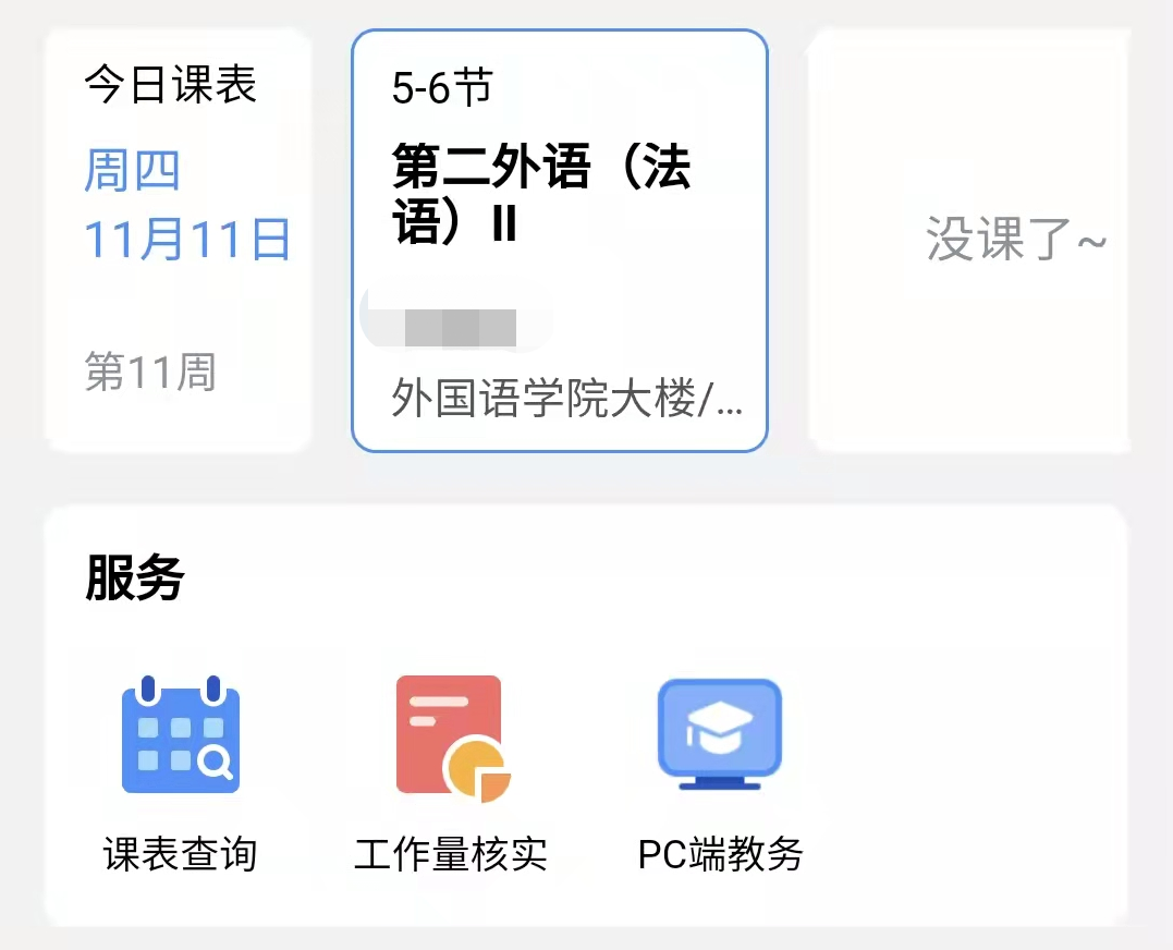 - 首页的【今日课表】自动定位当前需要上的课程,可左右滚动查看当日所有课程。点击可查看完整课表。