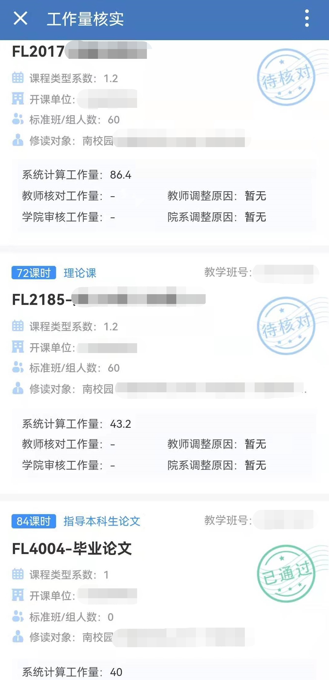 - 展示教师个人教学工作量,提示需要核实的工作量。