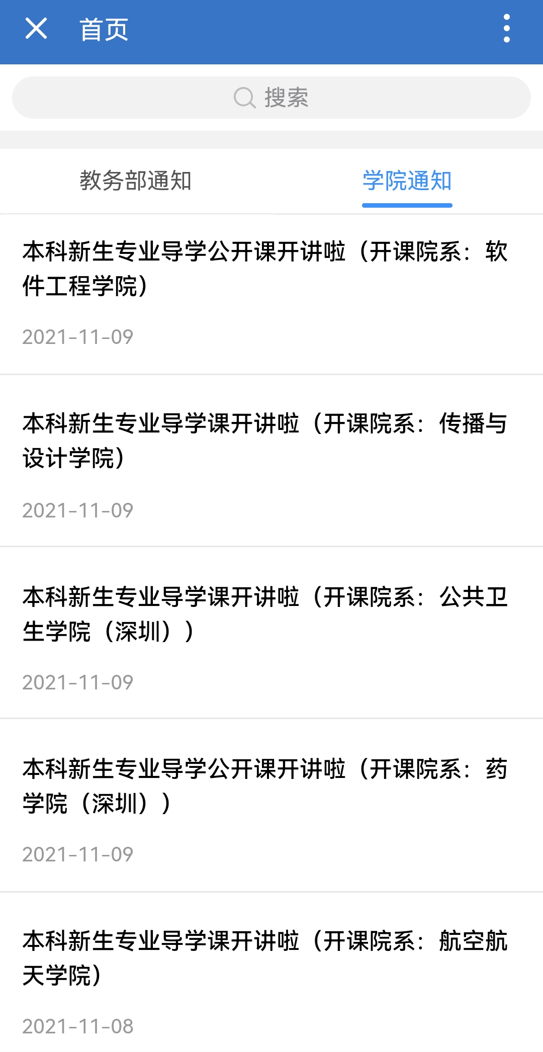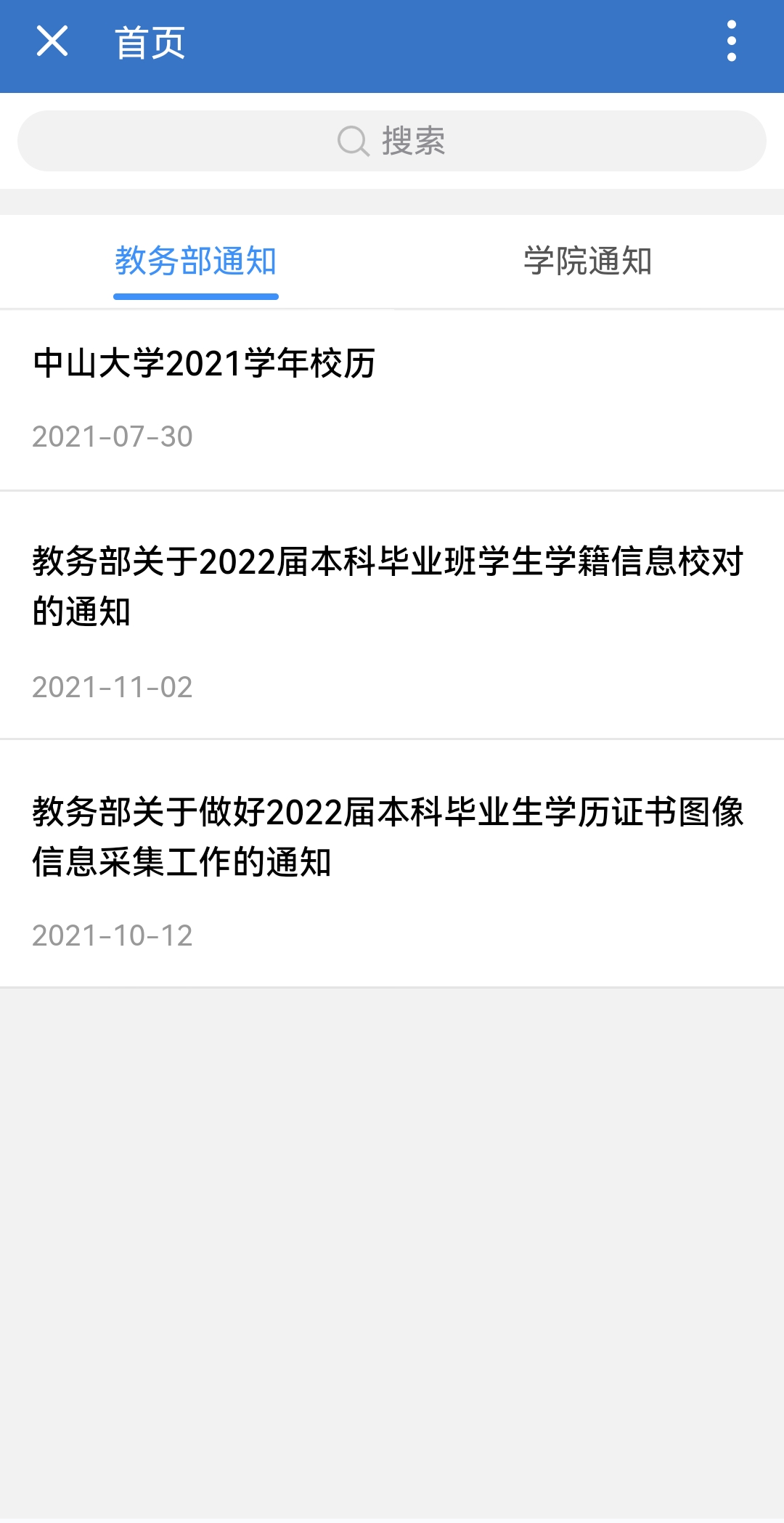 - 展示教务相关最新的公告,点击可进入公告详情页面。