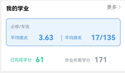 - 展示学生个人必修/专选平均绩点、平均排名、已完成学分、毕业所需学分,点击【更多】可查看学生个人学分情况、学业预警和成绩分布图情况。