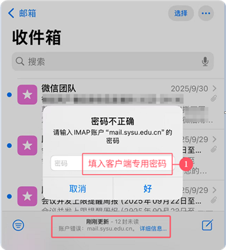 2. iPhone邮件客户端:底部会显示“帐户错误......"等信息,一般会弹出“密码不正确”的提示,填入客户端专用密码,完成密码更新。